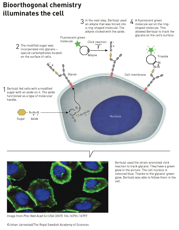 C’est Carolyn Berzotti qui a introduit ce concept en 2003 et il faut comprendre par là qu’il s’agit de l’ensemble des réactions conduisant à la formation ou la rupture de liaisons au sein des milieux biologiques sans interagir (c’est le sens particulier du mot orthogonal ici !) avec les fonctions chimiques présentes dans des milieux complexes : intracellulaire, le sang ou même jusqu’à l’organisme tout entier. C. Bertozzi avec son équipe a généralisé la réaction entre des azotures et des alcynes greffés sur toutes les molécules type sucres d’un organisme vivant tels que les modèles du poisson-zèbre ou la souris en ajoutant sur les molécules des groupes fluorescents permettant de suivre l’évolution réactionnelle.