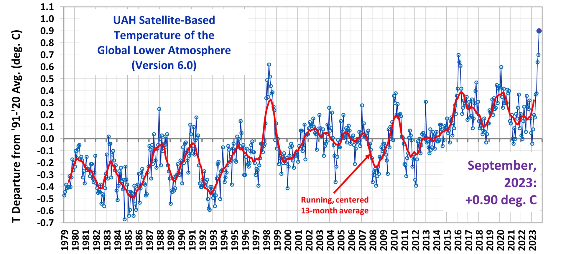 Figure 1. Température de la basse atmosphère au niveau mondial basée sur le satellite UAH, jusqu'en septembre 2023