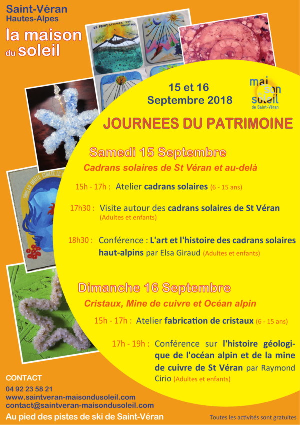 Venez participer aux Journées du Patrimoine à la Maison du Soleil à Saint-Véran les 15 et 16 septembre 2018 autour des thèmes Cadrans solaires de Saint Véran et au-delà et Cristaux, mines de cuivre et océan.