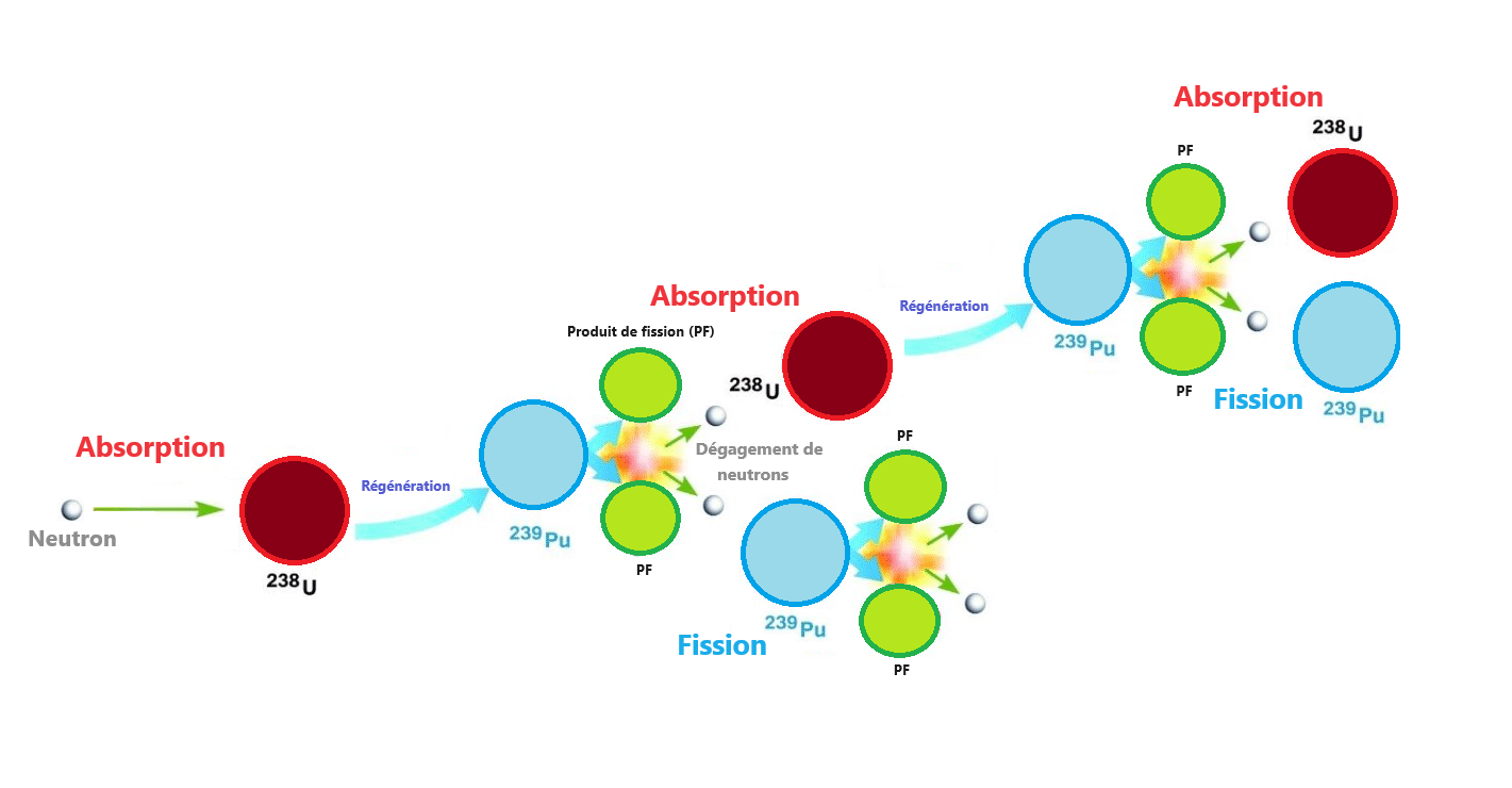 Cette réaction se produit déjà un peu dans les réacteurs thermiques (RNL) mais on peut la favoriser dans les réacteurs sans ralentisseur, où par exemple on remplace l’eau par le sodium liquide. Ces réacteurs à neutrons rapides (RNR) vont générer et utiliser avec plus de chances comme élément fissile le plutonium (Pu) et d’autres produits de fission (3).