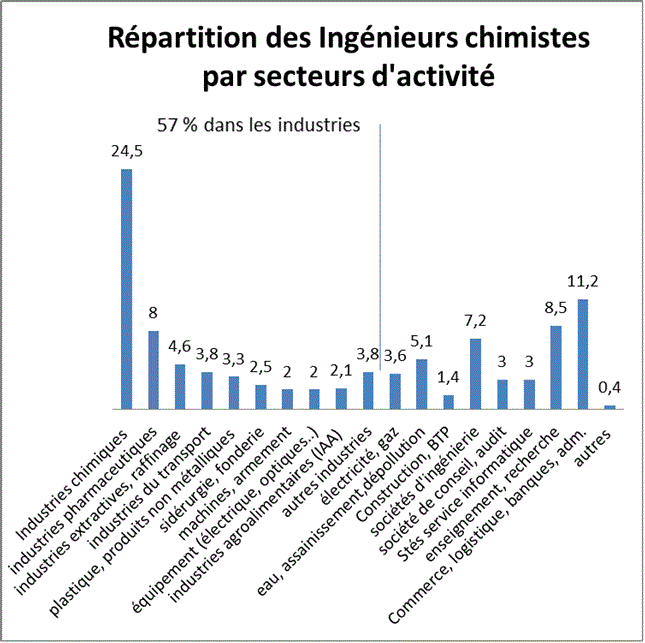 Les chimistes sont recrutés dans la plupart des secteurs d’activités. La dernière enquête de l’UNAFIC (Union Nationale des Associations Françaises d'Ingénieurs Chimistes) en donne la répartition suivante pour les ingénieurs.