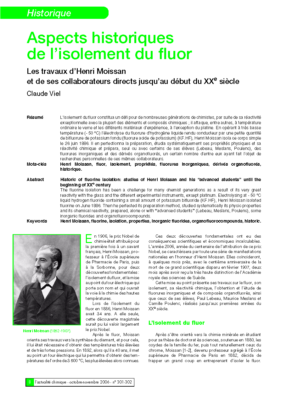 fluor, fluorures, Henri Moissan (1852-1907), électrolyse, basse température, prix Nobel