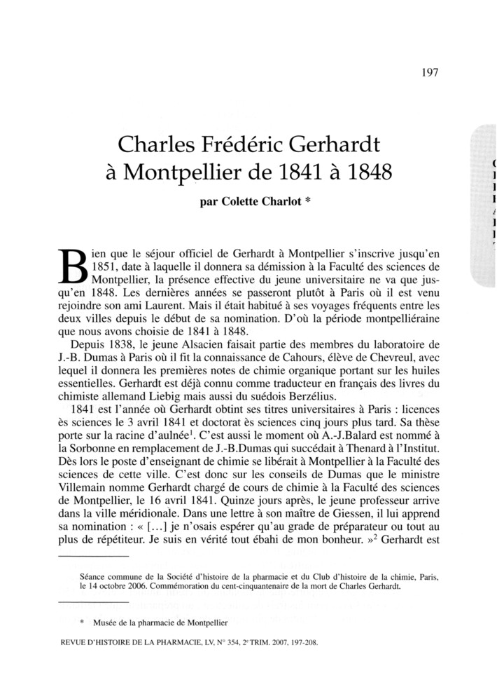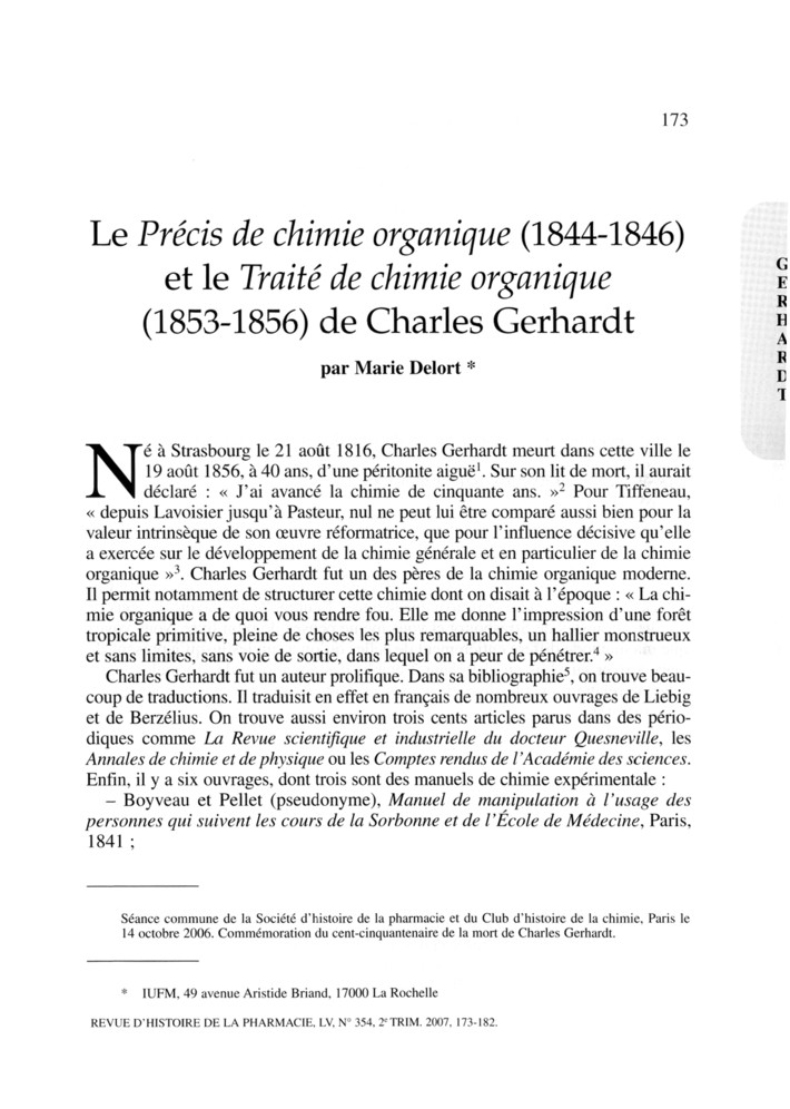 Gerhardt, chimie organique, quinoléine, brucine, séries homologues, expertise, Jacques Etienne Bérard, correspondance avec Dumas, Journal de pharmacie du Midi, système unitaire