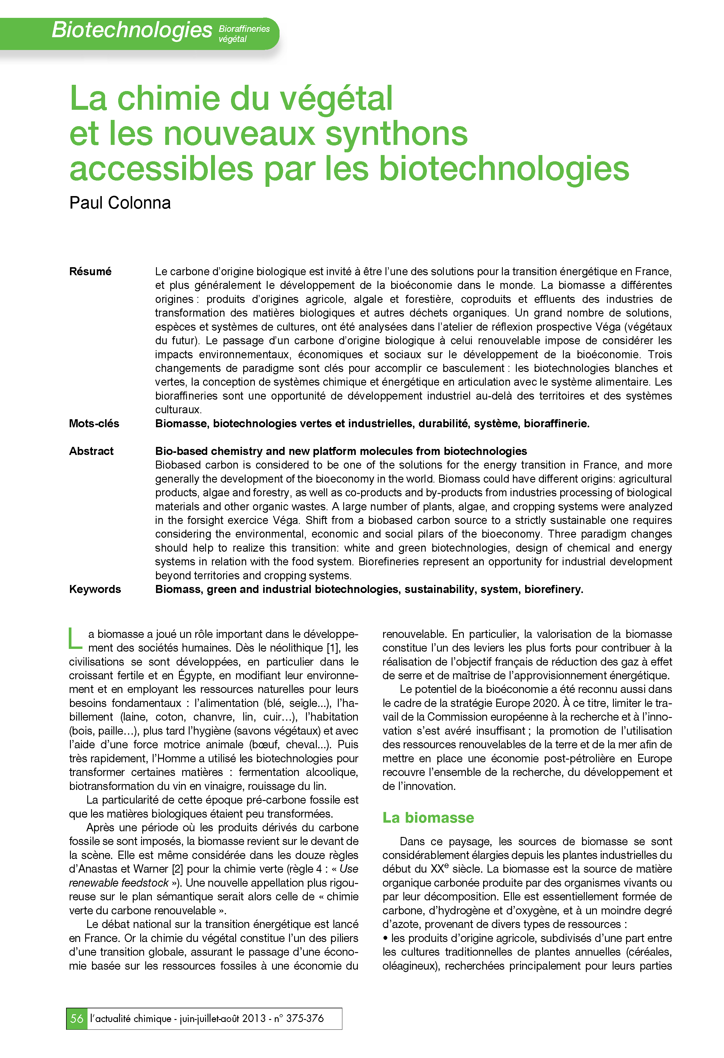 La chimie, la biologie et l’écologie sont étroitement liées dans une agronomie respectueuse de l’environnement, maintenant incontournable. La priorité est de connaître et minimiser les risques sanitaires et environnementaux liés aux produits utilisés. La chimie du végétal, grâce aux biotechnologies et à l’ingénierie métabolique, transforme les produits agro-industriels en monomères et polymères pour la chimie.