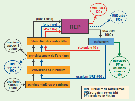 minerai uranium, isotopes, 238U, 235U, enrichissement, diffusion, centrifugation, fluorures, réacteurs nucléaires, recyclage