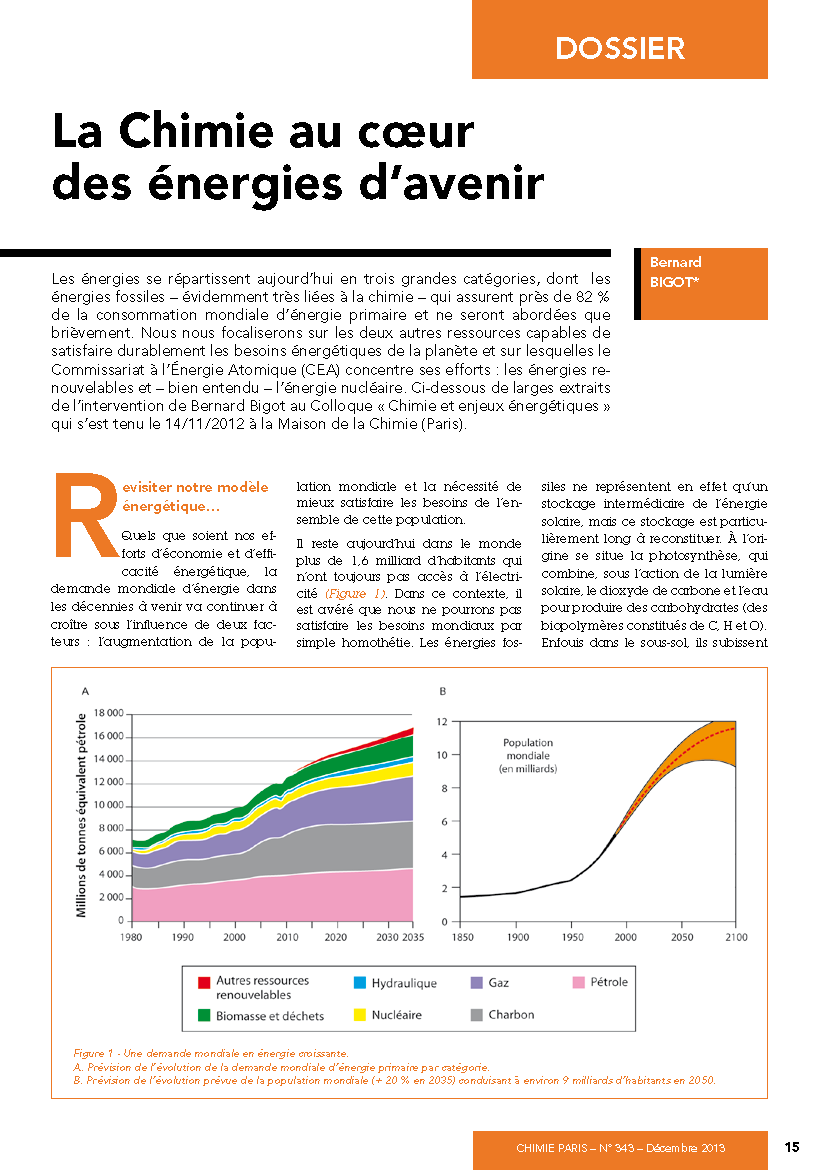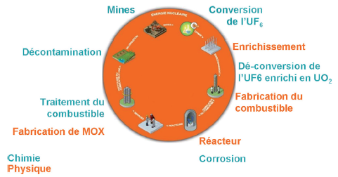 La chimie occupe une place centrale dans l'énergie nucléaire, de l’extraction du combustible à la sécurité en passant par le fonctionnement des réacteurs. Aujourd'hui, les enjeux se concentrent sur l'aval du cycle. La gestion durable des matières et des déchets radioactifs repose pour une large part sur un recyclage efficace du combustible usé, qu’il s’agisse d’utiliser au mieux les ressources naturelles en uranium ou de limiter la nocivité des déchets produits. La chimie des matériaux est essentielle pour concevoir des containers et des matrices de stockage sûrs et pour développer les nouveaux types de réacteurs. La chimie des actinides est un domaine de recherche pour les nouveaux types de réacteurs.