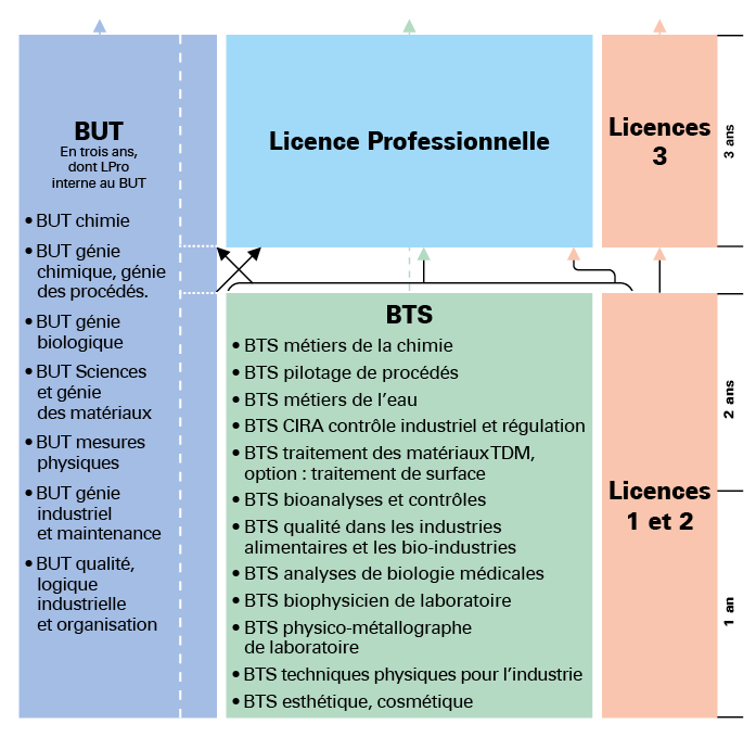 - BTS métiers de la chimie (4 pôles principaux : analyse, synthèse, formulation et principes de QHSSE - Qualité, Hygiène + santé, Sécurité, Sûreté, Environnement - ) ;