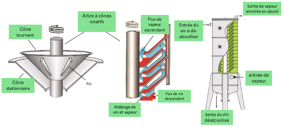 Elle utilise le principe de distillation sous pression réduite réalisée cette fois dans des colonnes en « acier inox » avec des ailettes fixées alternativement sur la paroi et sur l’arbre de rotation. La rotation entraîne la formation d’un film continu de liquide tout le long de la colonne. Le temps de séjour du liquide dans la colonne est de 20 secondes, ce qui permet à des colonnes industrielles d’avoir un débit de 100 L/h. Cette technologie est très efficace et permet de désalcooliser un vin jusqu’à une teneur de 0,02 % en alcool (voir figure 2) .