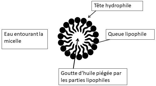 La tache de graisse va être emprisonnée par les queues lipophiles des molécules qui s’organisent autour d’elle en sphère, les parties hydrophiles étant en contact avec l’eau. L’ensemble est appelé une micelle.