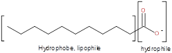 Dans l’ion carboxylate l’extrémité de la chaîne COO- est hydrophile (qui aime l’eau) et la longue chaîne R est lipophile (qui aime la graisse). Ces deux propriétés simultanées permettent d’ôter la graisse d’un vêtement, de la peau ou de tout objet et de l’entrainer avec l’eau(3).