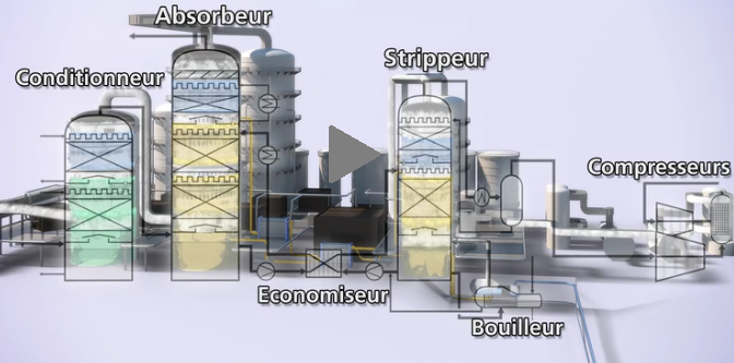 Toutes les étapes du procédé sont détaillées, expliquées et visualisées : traitement préalable des fumées, élimination des impuretés, recyclage du solvant, échangeurs de chaleur et comment réduire la consommation énergétique. Une installation pilote est installée au Havre.