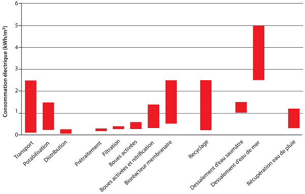 La figure 1, indique des fourchettes de valeurs concernant la consommation en électricité des différentes opérations décrites précédemment tout au long du cycle de l’eau. Selon les cas de figure, le captage, la potabilisation, la distribution, la collecte et l’épuration de 1 m3 nécessitent entre 1,8 et 9,5 kWh.