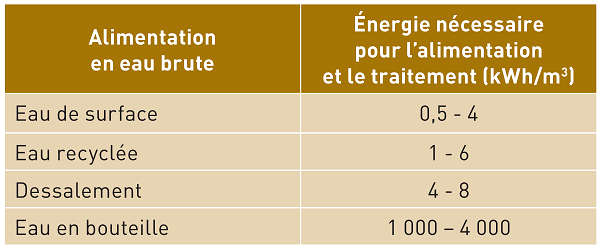Tableau 1 : Consommation énergétique en fonction de l’eau à traiter. Source : Eau et énergie sont indissociables p. 12 (14)