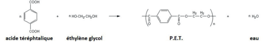Le PET est un polyester, polymère thermoplastique obtenu par la polycondensation de l’acide téréphtalique et de l’éthylène glycol selon (4) :