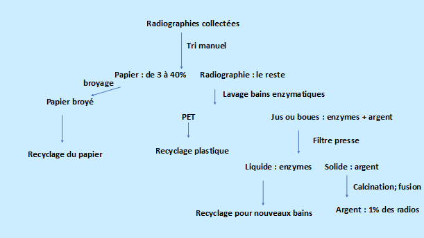 Les radiographies sont d’abord triées manuellement pour séparer le papier (emballage, compte-rendu) du film proprement dit. Celui-ci est avant impression un support en PET (PolyEthylene Terephthalate en anglais) recouvert d’une émulsion (contenant des cristaux d’halogénures d’argent (i) de 0,2 à 4 µm dans de la gélatine (ii)) et d’un revêtement de protection en gélatine pure (2). L’obtention de la radiographie se fait par réduction des ions Ag+ en argent métallique. Lorsque la radiographie arrive au circuit de recyclage elle se compose du support PET et d’un dépôt d’argent métallique incrusté dans la gélatine.