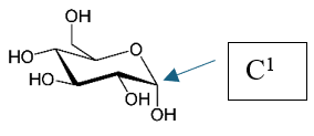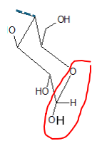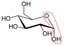 (ii) Ces 2 structures sont dites anomères et le carbone n°1 est un site anomérique. Elles sont en équilibre par ouverture puis fermeture du cycle au niveau de la fonction acétal (entourée en rouge sur la figure ci-contre).
