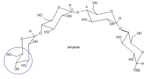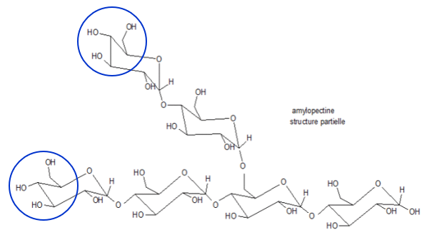 (vii) En effet, l’attaque commence par les extrémités non réductrices des molécules de l’amylose et de l’amylopectine. Voir sur les figures 2b et 3b les parties entourées en bleu. Pour une chaîne d'amylose, il n'y a qu'une extrémité non réductrice, alors qu'il y en a plusieurs (en raison des ramifications) pour une chaîne d'amylopectine. L’extrémité réductrice est la fonction acétal (entouré en rouge) capable de s’ouvrir pour redonner l’aldéhyde réducteur. En outre, l'amylose adopte une conformation hélicoïdale, rendant l'accès des enzymes plus difficile.