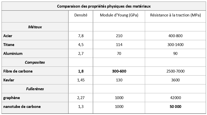 En fait, les fibres de carbone tissées sont imprégnées de résine époxy et c’est ce matériau composite qui possède un ensemble de propriétés remarquables (cf. tableau comparaison) :