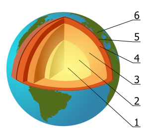 Coupe de la Terre du noyau à la croûte. (1) noyau interne; (2) noyau extérieur; (3) manteau inférieur; (4) manteau supérieur; (5) lithosphère; (6) croûte (partie supérieure de la lithosphère)
