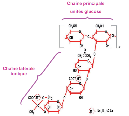 (iv) Les monomères β-D-glucose sont liés entre eux par liaison O-glycosidique (1->4). Cette chaîne porte tous les 2 glucoses un branchement latéral triosidique. Ce branchement est constitué d’un α-D-mannose lié à la chaîne principale par liaison osidique (1->3), d’un acide β-D-glucuronique lié au 1er mannose par liaison osidique (1->2) et d’un β-D-mannose lié à l’acide glucuronique par liaison osidique (1->4). Le 1er mannose est le plus souvent acétylé en position 6 et le 2e mannose peut être pyruvylé par liaison cétalique en positions 4 et 6.