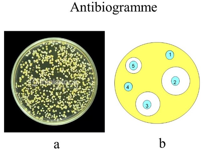 Il existe diverses méthodes plus ou moins automatisées, mais la plus simple à comprendre est d'opérer en boite de Pétri(iii). Sur un milieu nutritif et solide placé à 37°C pendant 15 à 24h les bactéries se développent (fig. 2a). Si avant de mettre à l'étuve on pose sur la boîte des disques de papier imprégnés de quantités standardisées de chaque antibactérien à tester, le diamètre d'inhibition de pousse autour de chaque disque indique le niveau de sensibilité de la souche à l'antibactérien : un contact indique que la résistance est élevée (fig. 2b). Ainsi, la bactérie représentée en jaune est très résistante (R) aux produits 1 et 4, résistante à 5 et sensible (S) à 2 et 3. On appelle Concentration Minimale Inhibitrice ou CMI la concentration d'antibactérien la plus faible pour laquelle il n'y a pas de croissance visible. Cette expérience est une expérience in vitro (fig. 3).