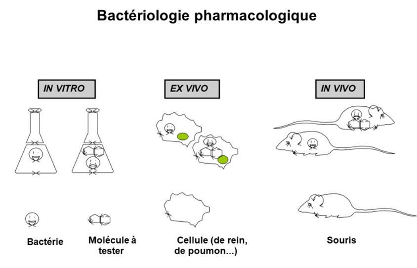(i) In vivo : sur un animal vivant ; in vitro : dans un tube à essais; ex vivo : sur un organe ou une cellule isolée.