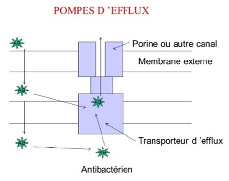 - éjecter l’antibactérien : pompes d’efflux (fig. 6) dans la membrane interne