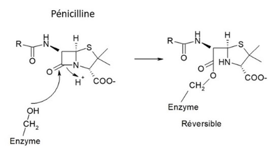 - modification de l’antibactérien, qui ne sera plus actif : enzymes d’inactivation (fig. 7 pour la pénicilline)