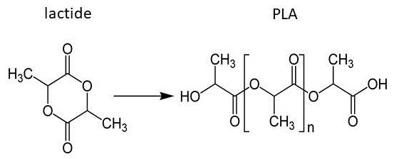 La dimérisation de l’acide lactique conduit à des lactides (esters cycliques) qui par ouverture de cycles conduisent à des poly(acide lactique), PLA, de stéréochimie contrôlée.