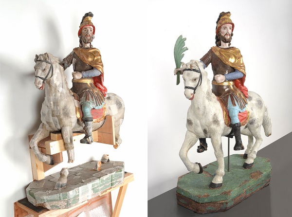 Statue équestre de saint Maurice avant et après consolidation et restauration.
