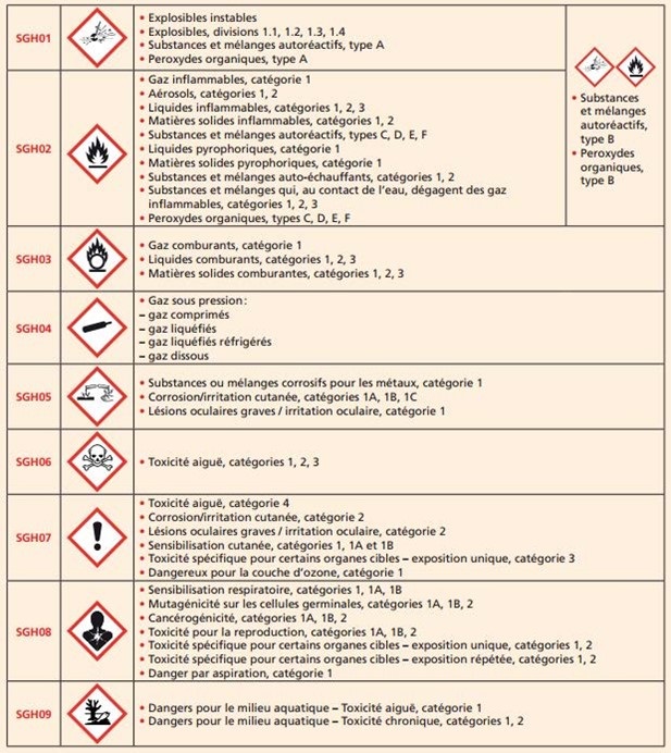 En fonction des propriétés physico-chimiques et des propriétés toxicologiques et éco-toxicologiques, les substances sont classées et étiquetées suivant des critères et symboles définis au niveau européen par le règlement CLP (Classification, Labelling, Packaging ou Classification, étiquetage et emballage) en cohérence avec le Système Général Harmonisé (SHG) reconnu internationalement.