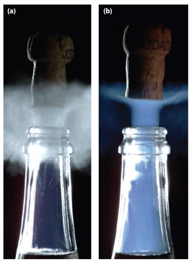 Observation des phénomènes lors du débouchage des bouteilles à 6°C (a) et 20°C (b) filmées à l’aide d’une caméra rapide (Phanton Flex, E.-U.) au bout de 1,2 ms après le saut du bouchon de champagne.