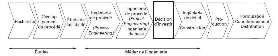L’Ingénieur de Procédé est au cœur de ce processus. Il commence par dialoguer avec les chercheurs pour définir ce que l'on appelle les bases de l’industrialisation : choix des conditions de réaction (catalyseur, température, pression, sélection des matières premières et des solvants). Suit alors la sélection du schéma de procédé avec ses opérations unitaires tenant compte des données cinétiques et thermodynamiques. Il décide s’il faut passer par une phase de pilotage avant de passer à la phase Ingénierie de réalisation qui est une phase lourde. De tout ce travail de recherche et d’études en amont découlera la réalisation industrielle.