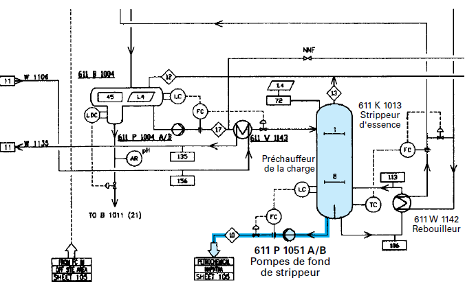 Son travail consiste alors à l’établissement des Schémas de procédés, PFD (Process Flow Diagram), des bilans matières et de chaleur (bilan enthalpique), à définir la nature des matériaux à mettre en œuvre, à identifier l’équipement principal (réacteur, colonnes à distiller, échangeurs de chaleur…) et à définir l’instrumentation (voir figure 4). Suivent les Schémas TI (Tuyauteries et Instruments), P&ID (Piping and Instrumentation Diagram) ainsi que la définition du matériel (Feuilles de spécifications) (*), et de tout ce qui sera nécessaire à l’INGÉNIERIE pour construire l’outil de production répondant à des critères de fiabilité, d’économie, de sécurité et d’environnement. Il contribue au calcul du prix de revient du produit fabriqué élément essentiel de détermination de la rentabilité d’un projet à partir du volume et du montant des ventes [4].