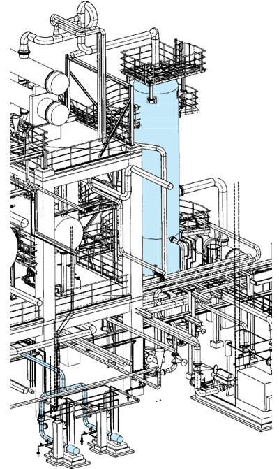 | Figure 4 : Exemple de procédé d’un strippeur d’essence (schéma partiel). Source : Techniques de l’Ingénieur AG 3300 MC CHARRIER | Figure 5 : Vue en élévation 3D de l’installation dont la fig. 4 représente le procédé TI AG 3300 MC CHARRIER |