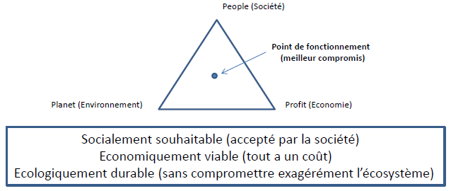 Cependant toute activité humaine a un impact sur l’environnement au sens le plus large ; l’impact Zéro comme le risque zéro n’existe pas. Le point de fonctionnement du triangle de la figure 7 représente le meilleur compromis entre les 3 P : People, Profit, Planet.