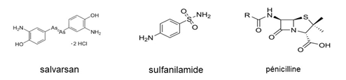 Les figures 3 et 4 montrent quelques antibactériens importants. On pense souvent que la pénicilline est le premier antibactérien connu. En fait, très tôt, certains composés étaient utilisés contre les infections : eau de Javel(x) comme désinfectant [3], mercure contre la syphilis ; dès 1897, le médecin militaire Ernest Duchesne a traité avec succès des porcs atteints de typhoïde porcine par la moisissure Penicillium glaucum(xi). En 1911, avec le chimiste Alfred Bertheim et le bactériologiste Sahachiro Hata, Paul Ehrlich met au point le Salvarsan, actif contre la syphilis. En 1936, à l'Institut Pasteur de Paris, Thérèse et Jacques Tréfouël [4] synthétisent les sulfamides (fig 2), actifs contre de nombreux germes. Quant à la pénicilline, découverte par sérendipité [5] en 1928 par Fleming, son intérêt thérapeutique n'apparut que vers 1939(xii).