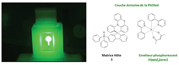 Pour augmenter l’efficacité de l’émission de lumière un émetteur phosphorescent est nécessaire, par exemple un complexe d’iridium pour une émission de lumière verte (voir note) avec une efficacité supérieure à celles obtenues antérieurement [9]. L’objectif ultime est de développer des SL-PhOLED à émission de lumière blanche pour l’éclairage !