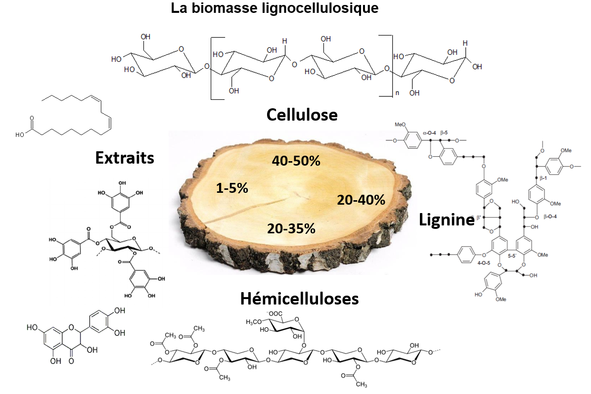 Le bois est constitué essentiellement de trois polymères biosourcés étroitement imbriqués : la cellulose, les hémicelluloses et la lignine (fig. 1) dans des rapports 2/1/1 environ. La cellulose est un homopolymère linéaire constitué d’enchaînements de monomères de glucose associés par des liaisons éther (C-O-C) β-(1→4). Les hémicelluloses sont des hétéropolymères à chaînes constituées de différents monomères d'oses : glucose, xylose, mannose, arabinose, galactose, rhamnose et acides uroniques, ramifiées et entrelacées.